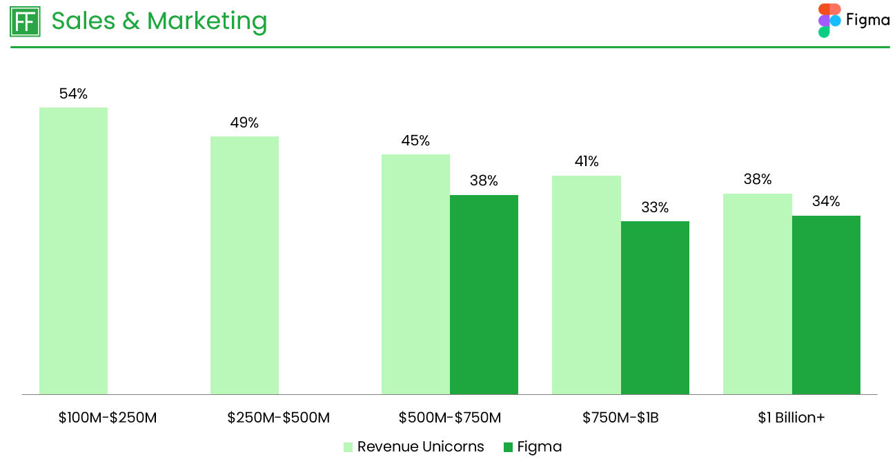 Figma invested more in research and development than the median Revenue Unicorn throughout their journey to $1 Billion in annual revenue. Figma’s spend on research and development mirrored that of Rubrik and Workday.