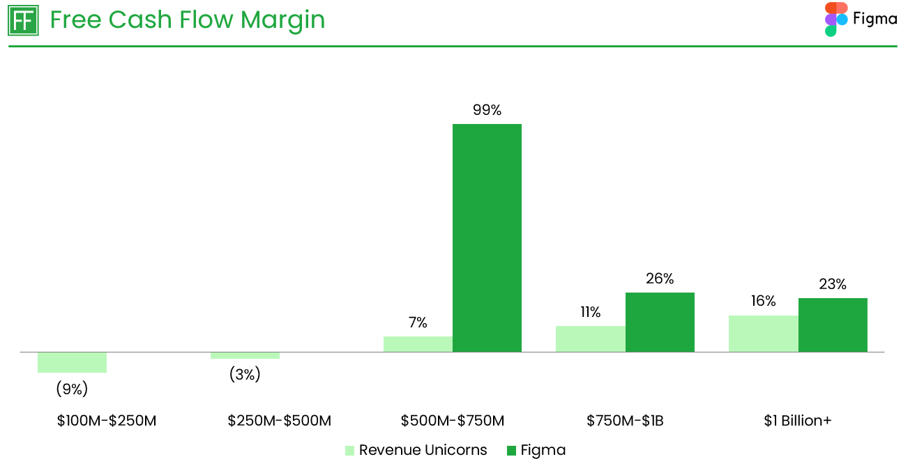 Figma’s free cash flow margin was 20%+ scale. Notably, their spike in free cash flow margin between $500 Million and $750 Million in revenue was due to a $1 Billion deal termination fee when the potential acquisition by Adobe did not go through.