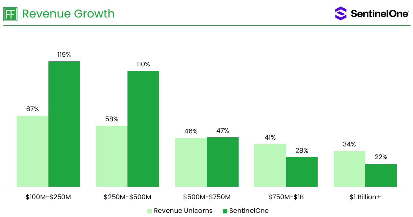 SentinelOne exceeded the Revenue Unicorn median growth rate from $100 Million to $500 Million in revenue, with growth surpassing 100% in each of these two revenue ranges. SentinelOne’s revenue growth trended toward the Revenue Unicorn median after passing $500 Million in revenue. Monday.com exhibited a similar revenue growth trajectory on the path to $1 Billion in annual revenue.