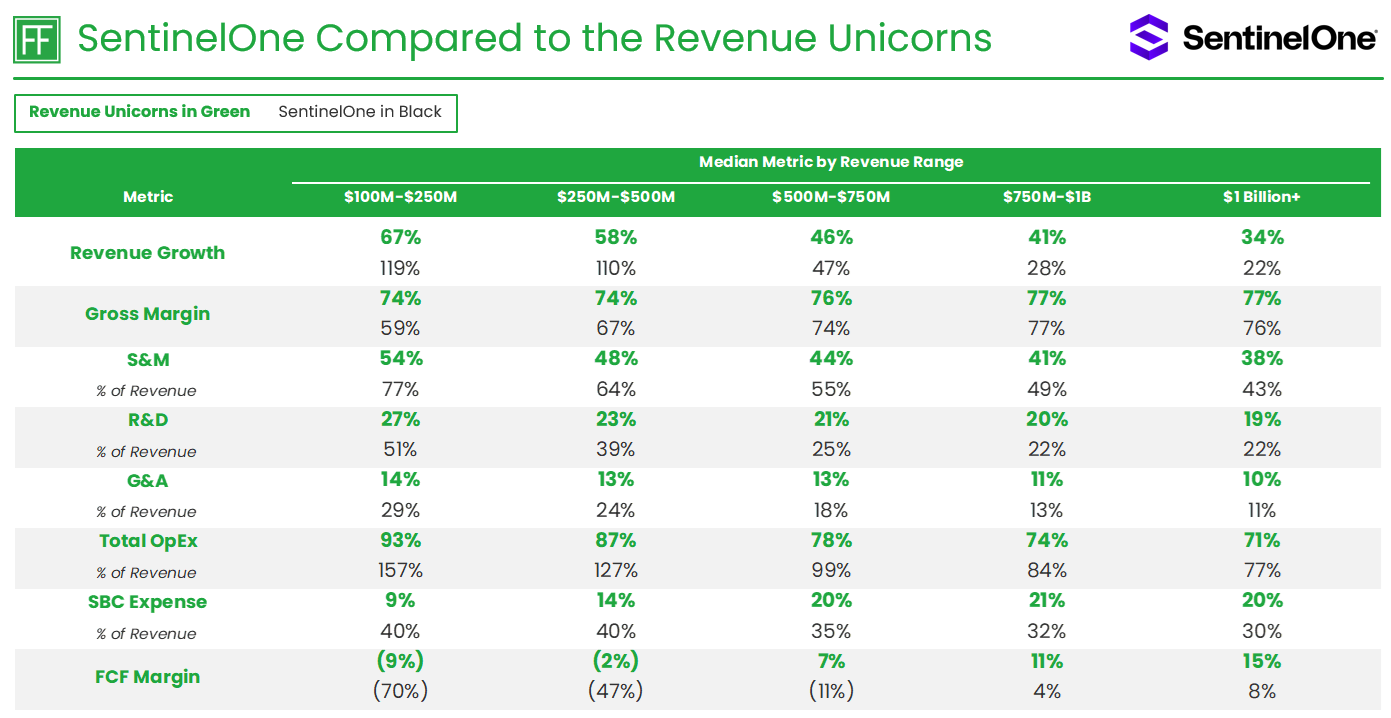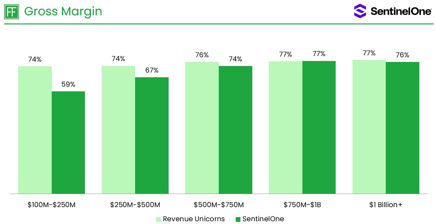 SentinelOne improved its gross margins throughout the journey, a sign of improved efficiency in its operating model. SentinelOne’s gross margin converged with the Revenue Unicorn median after passing $500 Million in revenue. CrowdStrike and Veeva had similar gross margin improvement on the journey from $100 Million to $1 Billion+ in revenue.