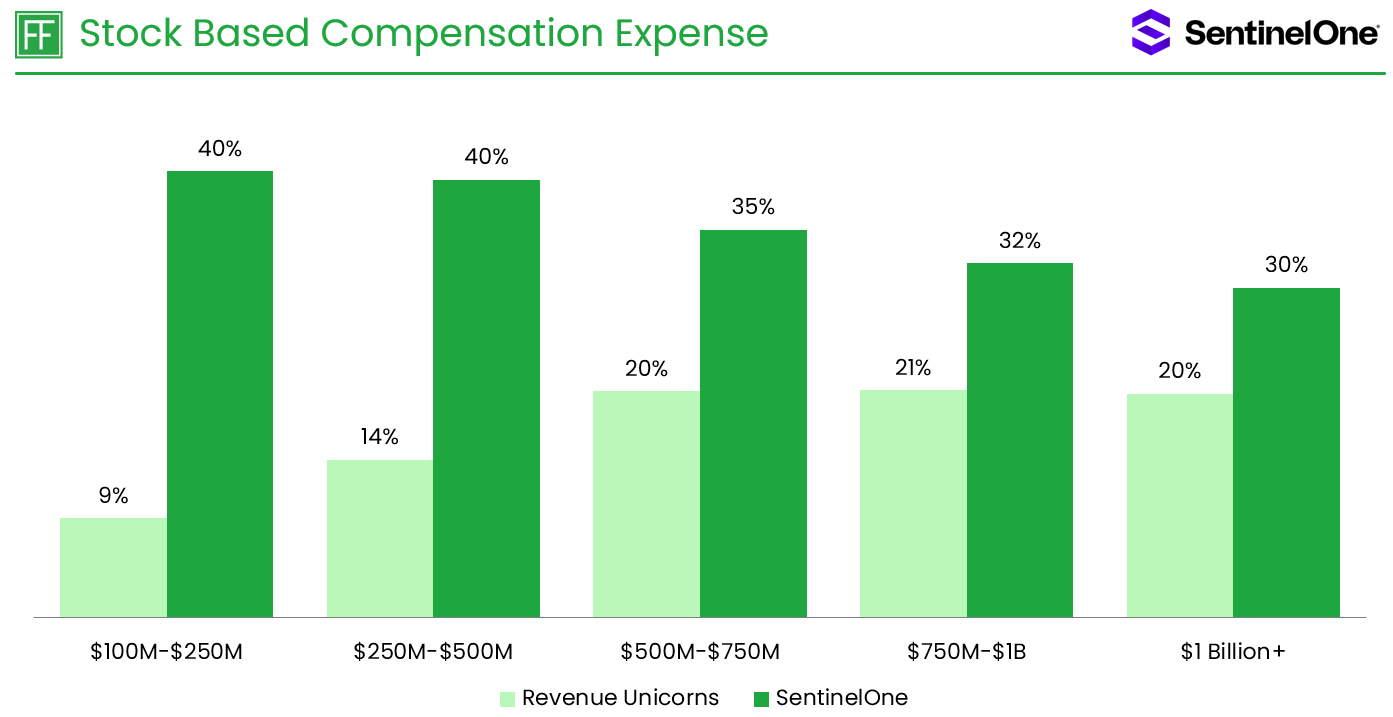 SentinelOne had a higher SBC expense as a percentage of revenue compared to the Revenue Unicorn median across all revenue ranges on the journey to $1 Billion in annual revenue. SentinelOne’s SBC expense as a percentage of revenue decreased with scale, declining from 40% between $100 Million and $250 Million in revenue to 30% after passing $1 Billion in revenue. When viewing SBC expense as a percentage of enterprise value, SentinelOne is at 5.7%, which is higher than the Revenue Unicorn median of 1.8% in the $1 Billion+ revenue range.